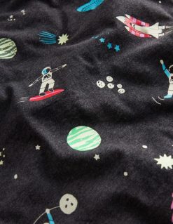 Dinozaurų arba kosmoso raštas, puošiantis šį medvilninį marškinėlį, atrodo kaip puikiai išdėstyti lipdukai, todėl, mūsų nuomone, tai dvigubai smagu.