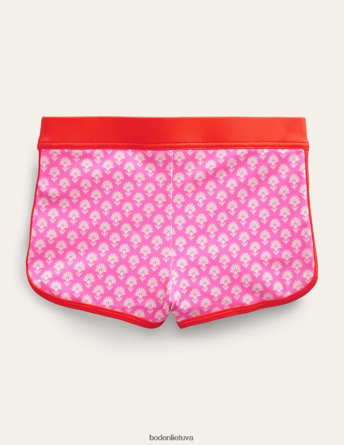ką mes matome vandenyje – plaukimo čempioną, dėvintį ryškių raštų šortus Šis dizainas pasižymi akį rėžiančiais raštais ir turi kontrastingos spalvos juosmenį ir aprišimą ant kojų, kad būtų sportiška apdaila.