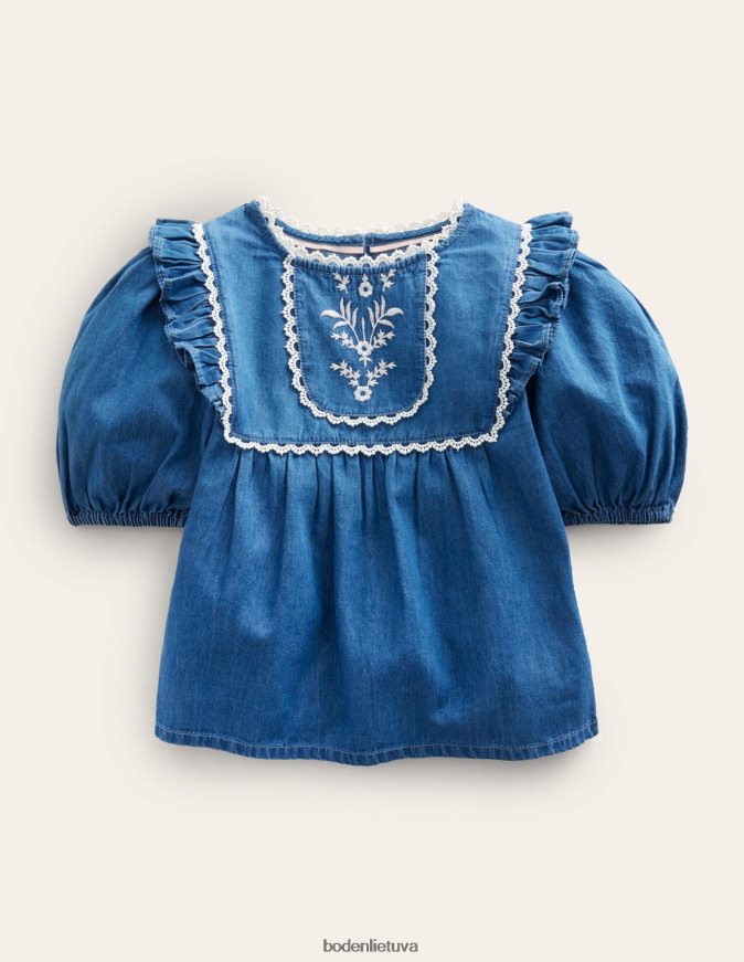 Gėlėtas siuvinėjimas ant šio medvilninio chambray viršaus ribojasi su raukiniais papuošimais. sukurtas kasdieniams dideliems ir mažiems nuotykiams.
