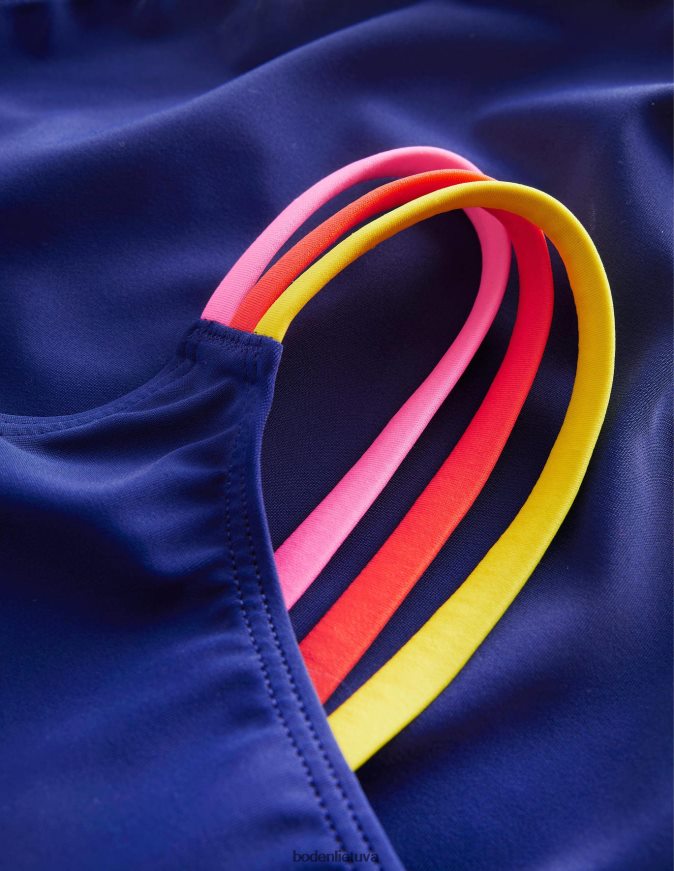 Pagyvinome šį klasikinį maudymosi kostiumėlį su apvalia kakle ryškiomis vaivorykštės kryžminėmis nugaros juostelėmis. puikiai tinka pasivaikščiojimams irklavimo baseine.