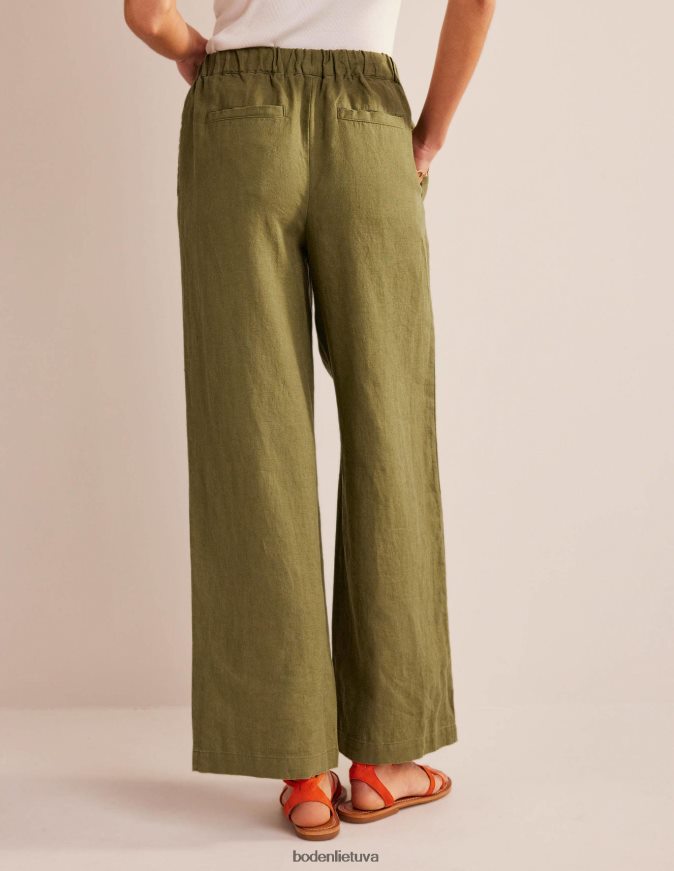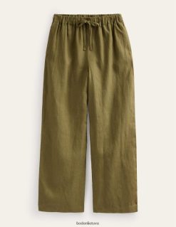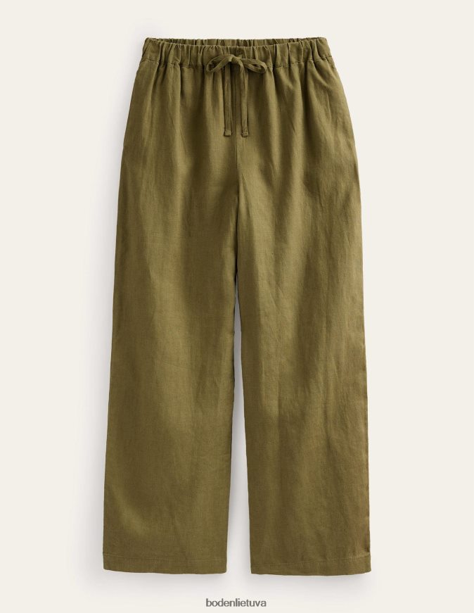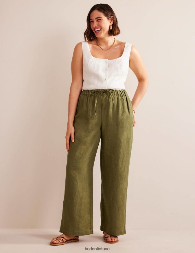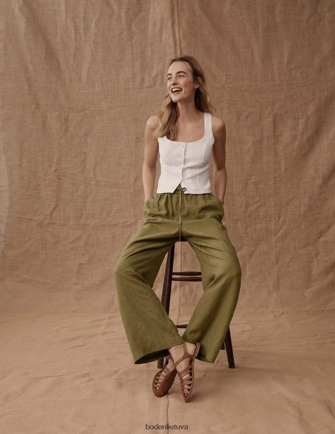 siūtos iš lino, šios vidutinio aukščio kelnės turi elastingą juosmenį su raišteliu, kad būtų patogus, atsipalaidavęs ir be jokių pastangų. sumodeliuokite juos su apatine marškinėliais arba marškinėliais ir viskas.