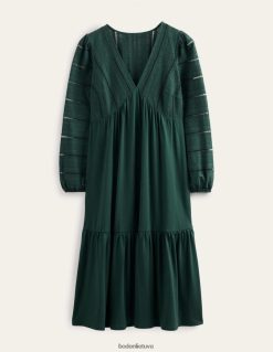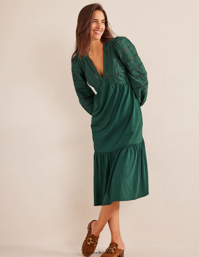 dalykai, dėl kurių šis medvilnės mišinio mišinys išsiskiria: dailiai austos broderijos detalės, glostantis empire juosmuo ir paslėptos kišenės siūlėse.