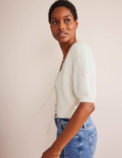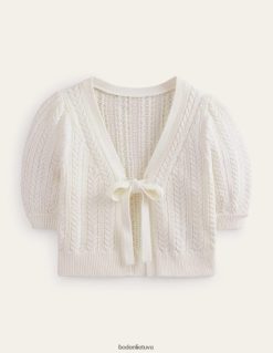 Patobulinkite kasdienę išvaizdą su šiuo kabeliu megztu medvilniniu megztiniu. jis užsegamas peteliške ir nukrenta iki juosmens – puikiai tinka formuoti su aukštu džinsu arba dengti ant suknelių.