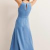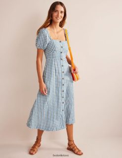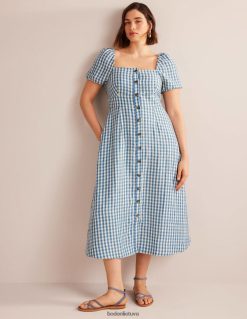 ši perdirbto lino midi suknelė su kvadratine iškirpte ir pūstomis rankovėmis suteikia vintažinį pojūtį. jo priekyje yra mygtukų pamušalas, o užpakalinė dalis suteikia papildomo judėjimo ir patogumo.