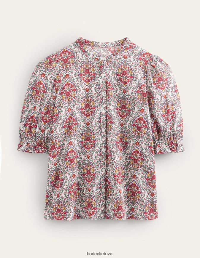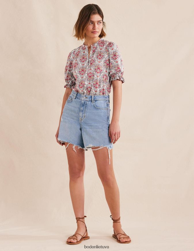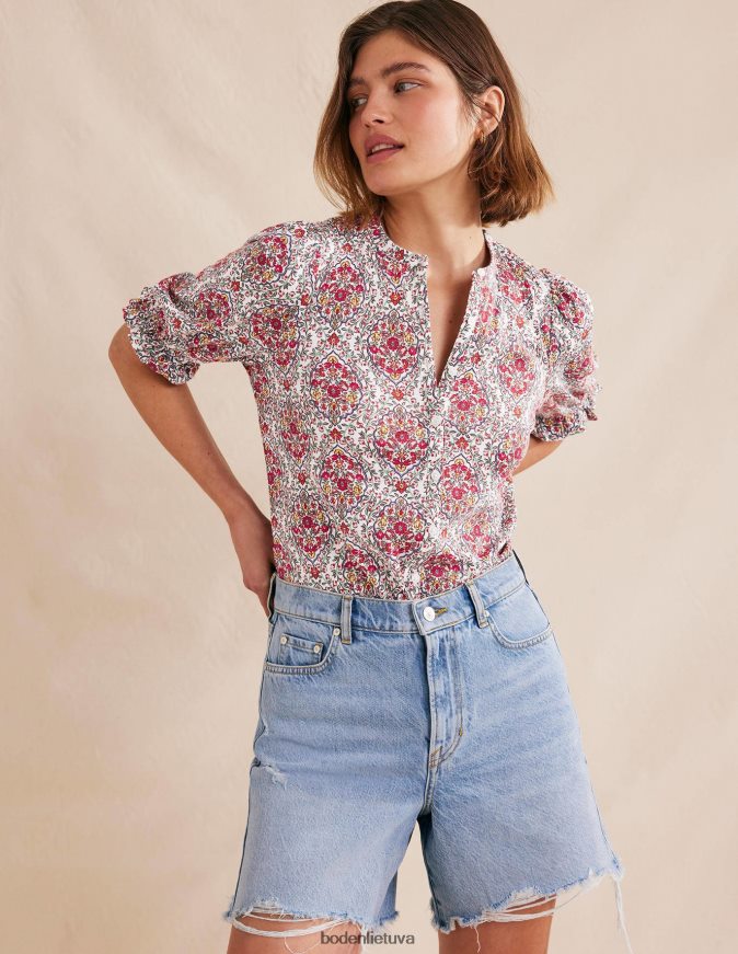 Gražus spaudinys ant šio suteptos medvilnės ir modalo mišinio viršaus pranoksta kasdienybę. raitytos palaidinės rankovės dar labiau prideda žavesio jas po megzta liemene arba pasipuošdami atskirai.