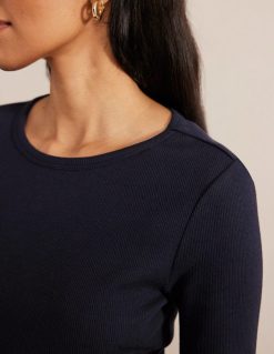 Pasitikėkite šiuo briaunuotu medvilninio trikotažo ilgomis rankovėmis, kaip beveik kiekvienos aprangos pagrindą.