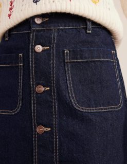 Nutrintais apvadais ir priekyje esančiomis sagomis šis daugiaaukštis džinsinis mini sijonas yra nesenstantis gabalas.