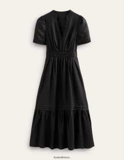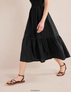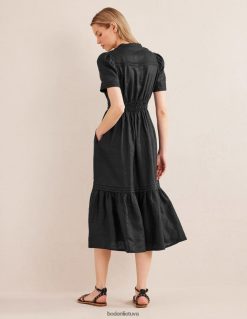 ši suknelė su pilnu sijonu pasiūta iš 100 % perdirbto lino, kad jaustųsi lengvas. ilgesnis ilgis suteikia formalumo priglundančiam ir besiplečiančiam siluetui, nepakenkiant patogumui.