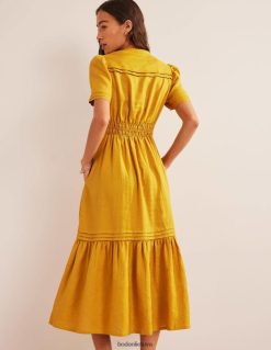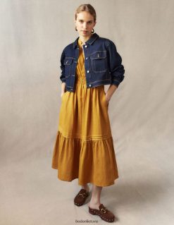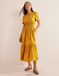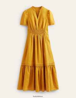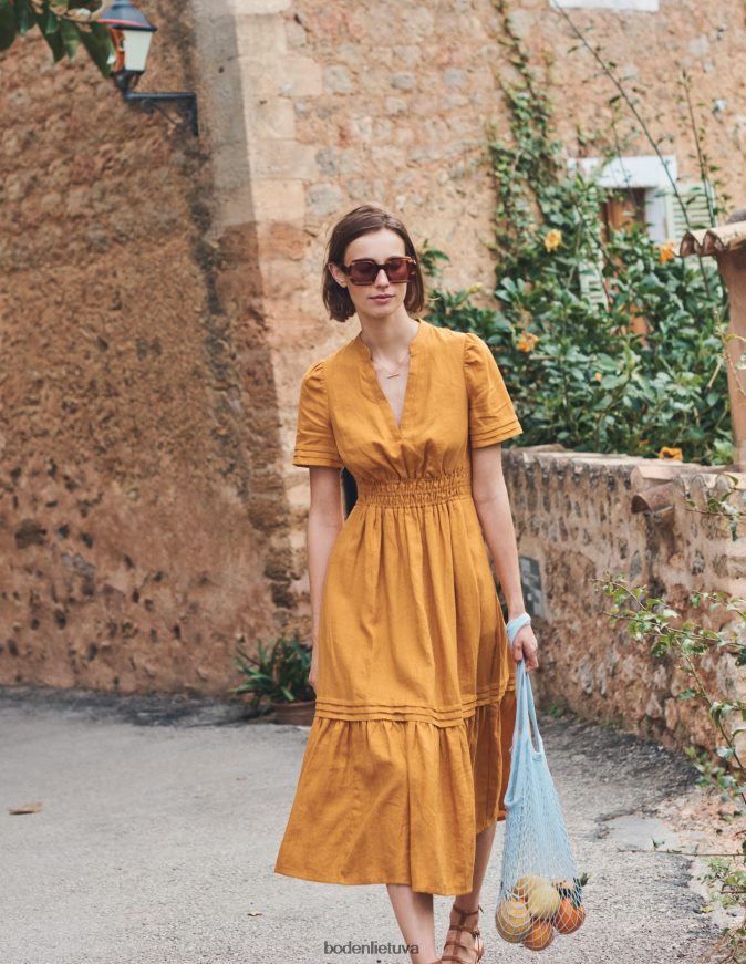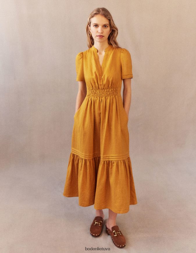 ši suknelė su pilnu sijonu pasiūta iš 100 % perdirbto lino, kad jaustųsi lengvas. ilgesnis ilgis suteikia formalumo priglundančiam ir besiplečiančiam siluetui, nepakenkiant patogumui.