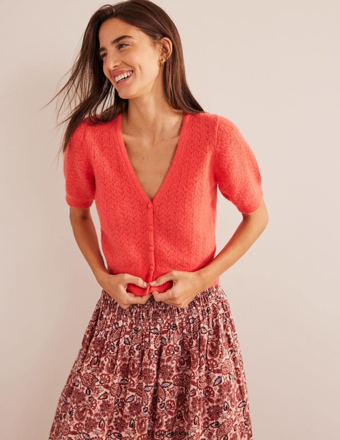 Megztas subtiliu puantelės raštu, šis trumparankovis megztinis yra švelnus, purus, suteikiantis moteriškumo. V formos iškirptė yra puikus pagrindas subtiliems papuošalams.