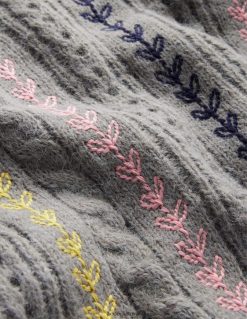 šis džemperis negaili smulkmenų. spalvingi siuvinėjimai ir puantelės akcentai suteikia žaismingumo, o mezgimas kabeliu ir purūs siūlai išlaiko minkštumą ir jaukumą.