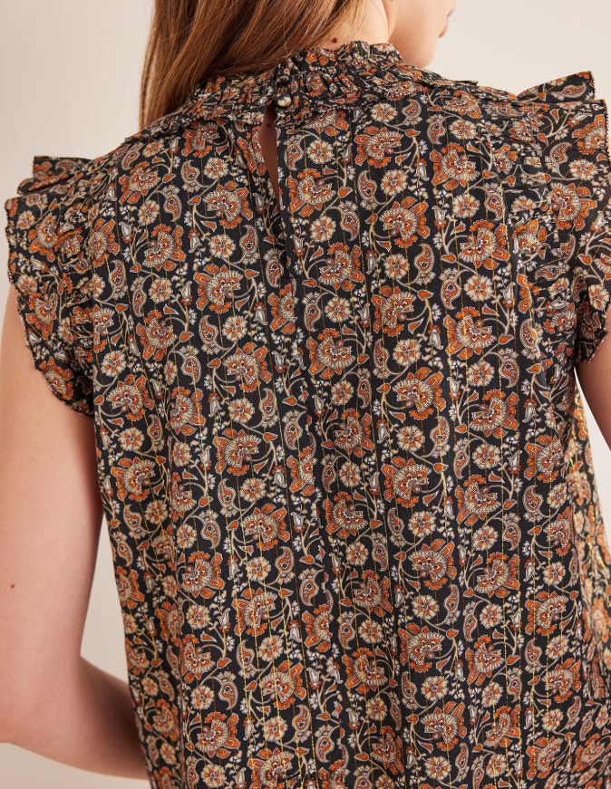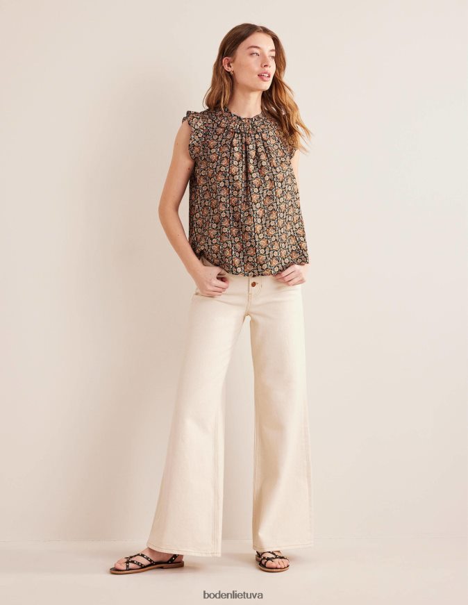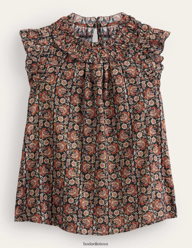 Sulenktos plokštės ir metalinės juostelės pakelia šį prerijų įkvėptą viršų. su blakstienų apdaila ir garbanotomis dvisluoksnėmis rankovėmis.