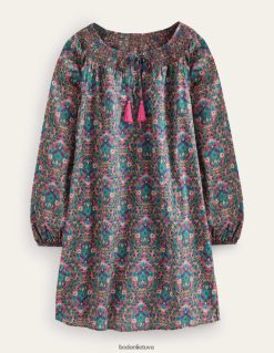 šis lengvas medvilninis kaftanas puikiai tinka šventei. jis iškirptas iki laisvos formos su aptempta iškirpte, kurią pabrėžia kutais raištyti kaklaraiščiai. užmaukite jį ant bikinio prie baseino.