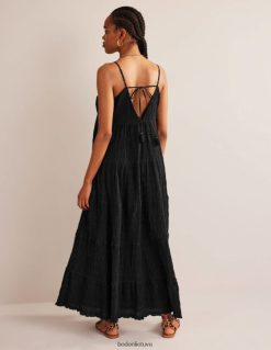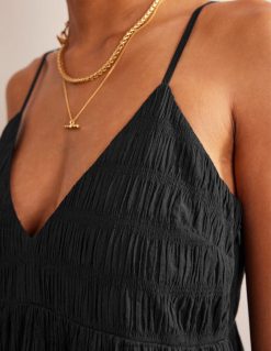 ši suknelė pasiūta iš tekstūruotos medvilnės – būtent tai, ką galbūt norėsite vilkėti paplūdimio dienomis ir vėjuotomis atostogų naktimis. sukirpta iki V formos iškirptės su užpakalinėmis raiščiais ir šoninėmis siūlėmis.