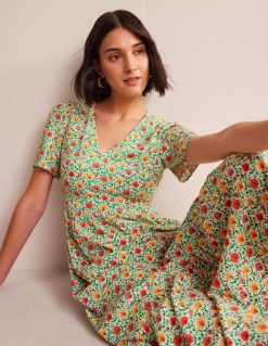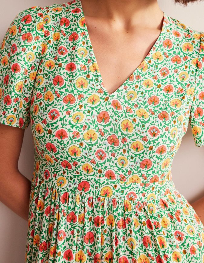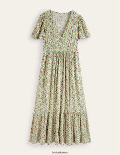 ši suknelė V formos iškirpte lengvai, bet efektyviai pabrėžia stilių. glostantis imperijos juosmuo tvirtinasi prie trumpų pūstų rankovių ir žaismingo daugiasluoksnio apvado.