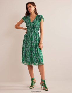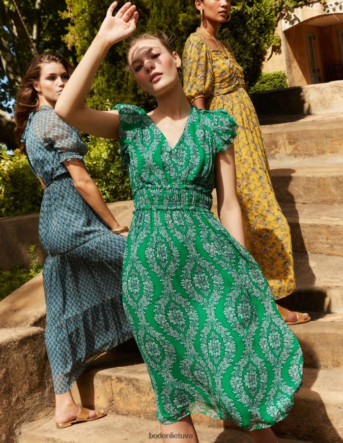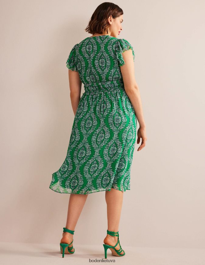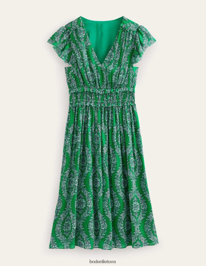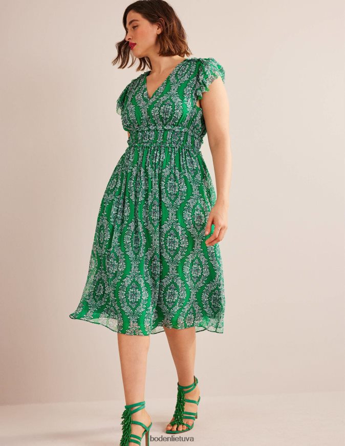 Surauktas šios midi suknelės juosmuo suteikia jai glostantį siluetą, puikiai tinkantį visoms būsimoms progoms. jis pagamintas iš žoržeto su angelinėmis rankovėmis ir krenta žemiau kelių.
