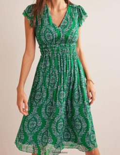 Surauktas šios midi suknelės juosmuo suteikia jai glostantį siluetą, puikiai tinkantį visoms būsimoms progoms. jis pagamintas iš žoržeto su angelinėmis rankovėmis ir krenta žemiau kelių.