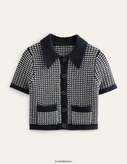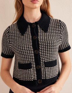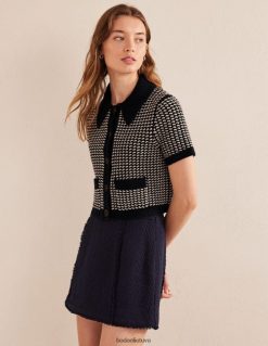šis trumpomis rankovėmis megztinis turi smailia apykakle, dvi priekines kišenes ir kontrastingus papuošimus, kad išvaizda būtų kasdieniška, bet rafinuota.