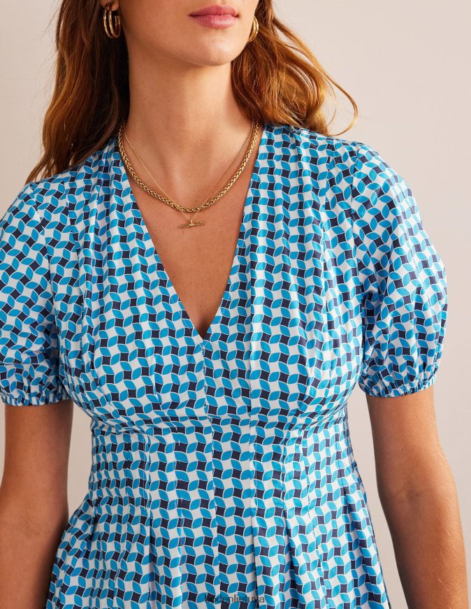 Smiginio juosmens detalė ant šios medvilninės mini suknelės suteikia pusiau aptemptos formos raiškumo. pūstos rankovės ir platėjantis pakraštys išlaiko modernumą, o gilus V formos iškirptė suteikia universalumo tiek dieną, tiek naktį.