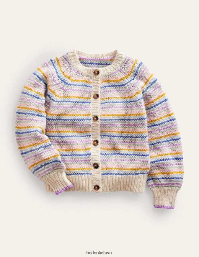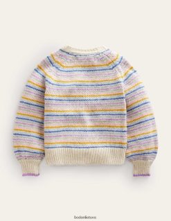 Šis storas medvilnės mišinio megztinis jaučiasi rankomis megztas. jis baigtas palaidinėmis rankovėmis ir yra saldaus dryžuoto rašto.