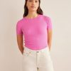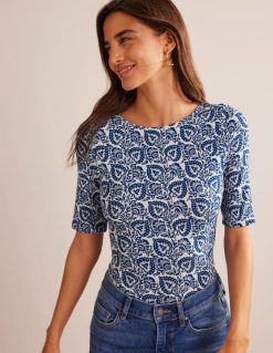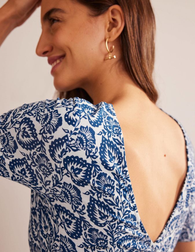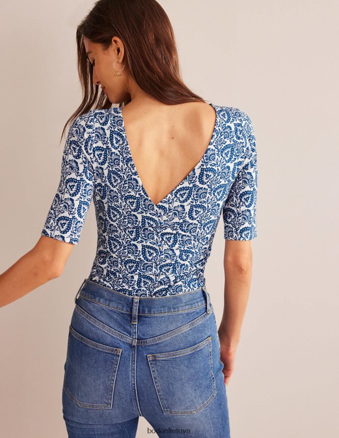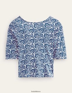 Apvyniota šio viršaus nugarėlė sukuria švelniai prigludusią formą. jis pagamintas iš minkšto džersio su įtempta iškirpte ir trumpomis rankovėmis.
