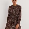 dalykai, dėl kurių šis medvilnės mišinio mišinys išsiskiria: dailiai austos broderijos detalės, glostantis empire juosmuo ir paslėptos kišenės siūlėse.