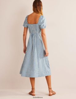 ši perdirbto lino midi suknelė su kvadratine iškirpte ir pūstomis rankovėmis suteikia vintažinį pojūtį. jo priekyje yra mygtukų pamušalas, o užpakalinė dalis suteikia papildomo judėjimo ir patogumo.