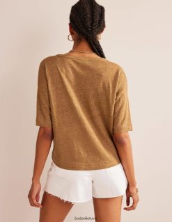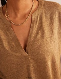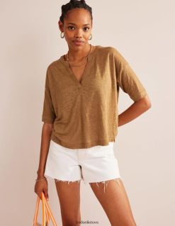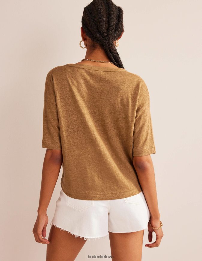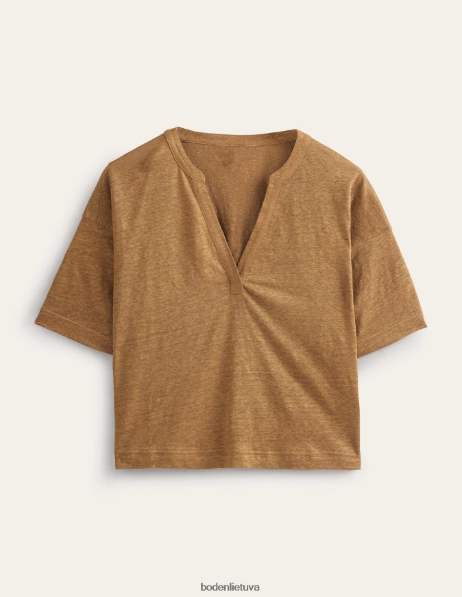 šis viršus pagamintas iš lengvo lininio trikotažo, kad būtų kvėpuojantis. jis iškirptas iki laisvos formos, kurią paryškina nuleisti pečiai ir atvira V formos iškirptė.