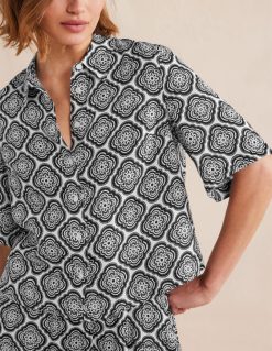 Gražus spaudinys ant šio suteptos medvilnės ir modalo mišinio viršaus pranoksta kasdienybę. raitytos palaidinės rankovės dar labiau prideda žavesio jas po megzta liemene arba pasipuošdami atskirai.