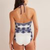 Kvadratinis šio maudymosi kostiumėlio kaklas ir nugara žada glostančią apdailą, o tinklinis pamušalas sukuria raižytą siluetą. fiksuoti kaušeliai išlaiko jį palaiko ir patogiai.