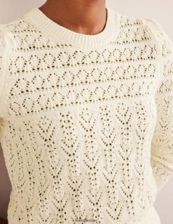 tekstūra kalba dėl šio medvilninio megztinio pointelle mezginio. Įrėmintas pūstomis rankovėmis, šiek tiek apkarpytas pakraštys papildys jūsų mėgstamą džinsą.