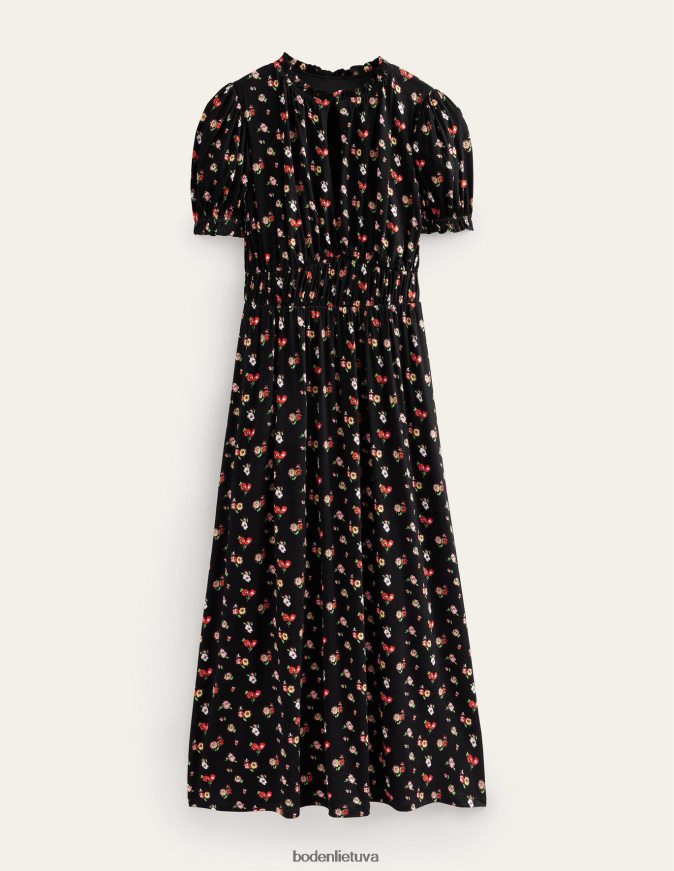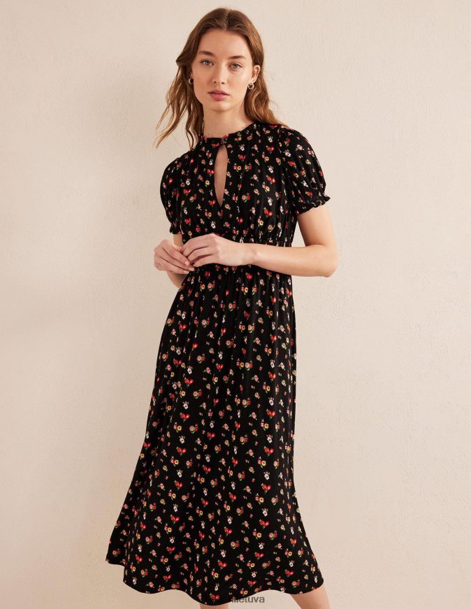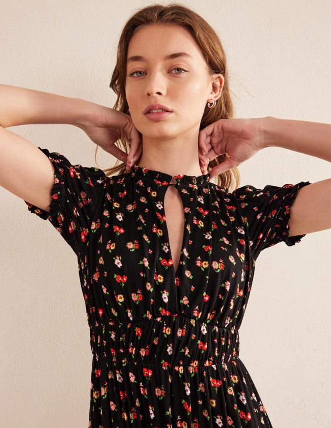 šios tamprio džersio midi suknelės rumbuotas liemenėlis priglunda prie pūstų rankovių ir sulenkto sijono.