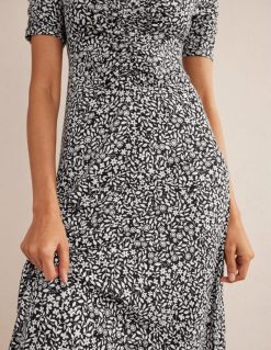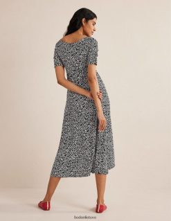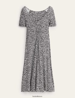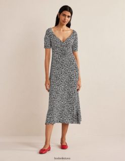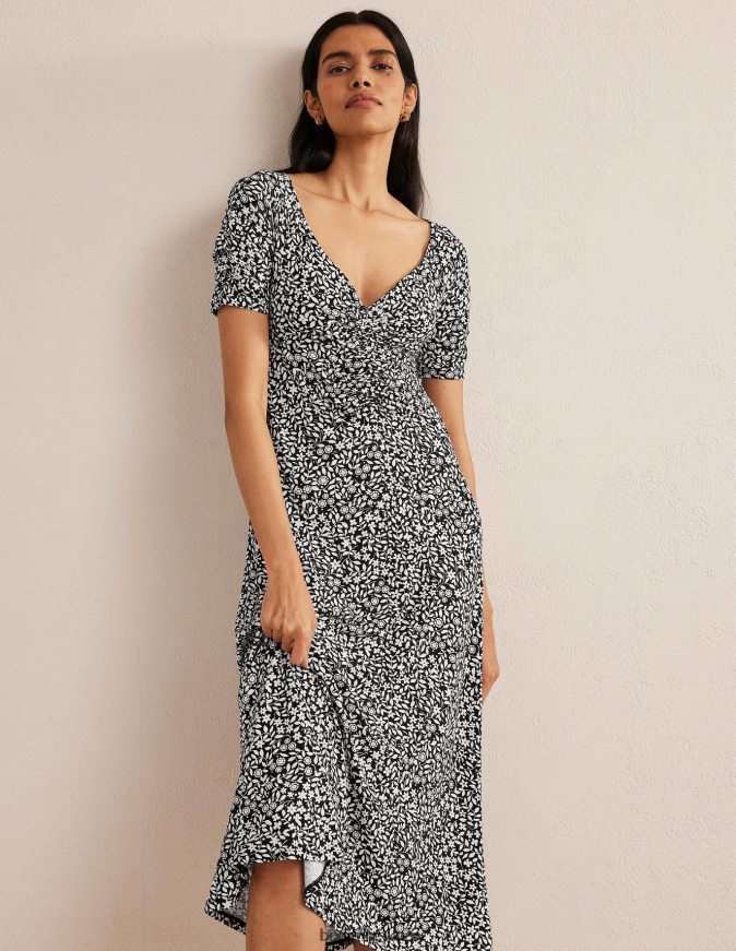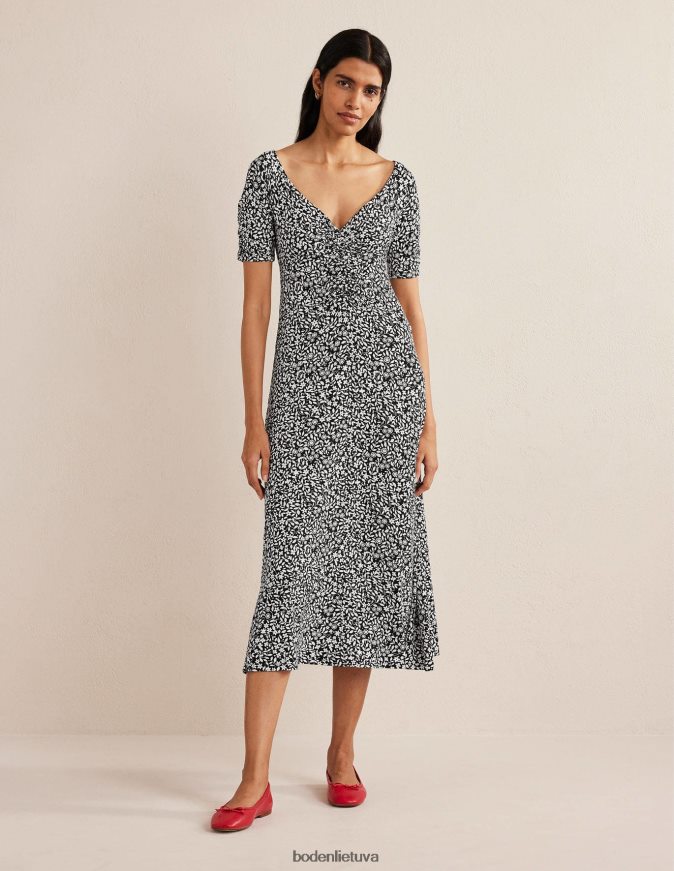 Švelnus vingiavimas per priekį ir rankoves išryškina švelnų šios tamprio trikotažo midi suknelės siluetą. stilizuokite sluoksniuotą arba solo, priklausomai nuo sezono.