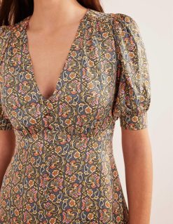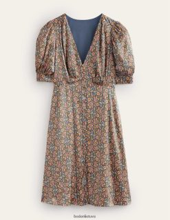 Ši arbatos suknelė yra pagaminta iš prabangaus atlaso, apipavidalinta imperijos juosmeniu ir audiniais dengtomis sagomis – dėvėkite savąją nuo ryto iki vakaro (tai universalu).