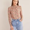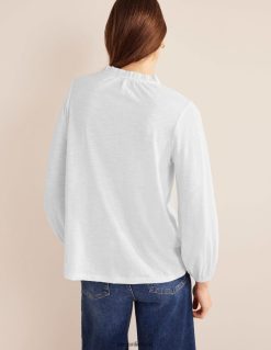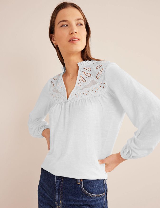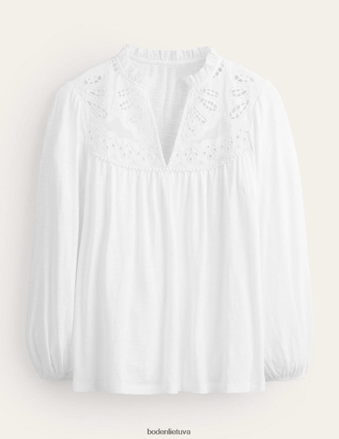 Šie slydimo medvilninio trikotažo marškinėliai su įmantriais nėrinių siuvinėjimais iškirpte ir banguotomis palaidinėmis rankovėmis.