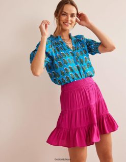 Šis mini sijonas, puikiai tinkantis kaip gaivus atostogų uždangalas, pasiūtas iš lengvo raukšlėto marlės audinio. jis yra daugiapakopis, kad siluetas būtų nepakartojamas, ir turi elastingą juosmenį, todėl jį lengva paslysti ant baseino.