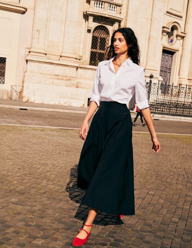 didelis ir vienodai universalus sijonas yra vidutinio ilgio. jis pagamintas iš lengvo taftinio audinio ir baigtas užtraukiamu juosmeniu ir firminėmis bodeno šoninių siūlių kišenėmis.