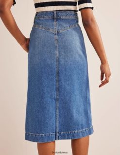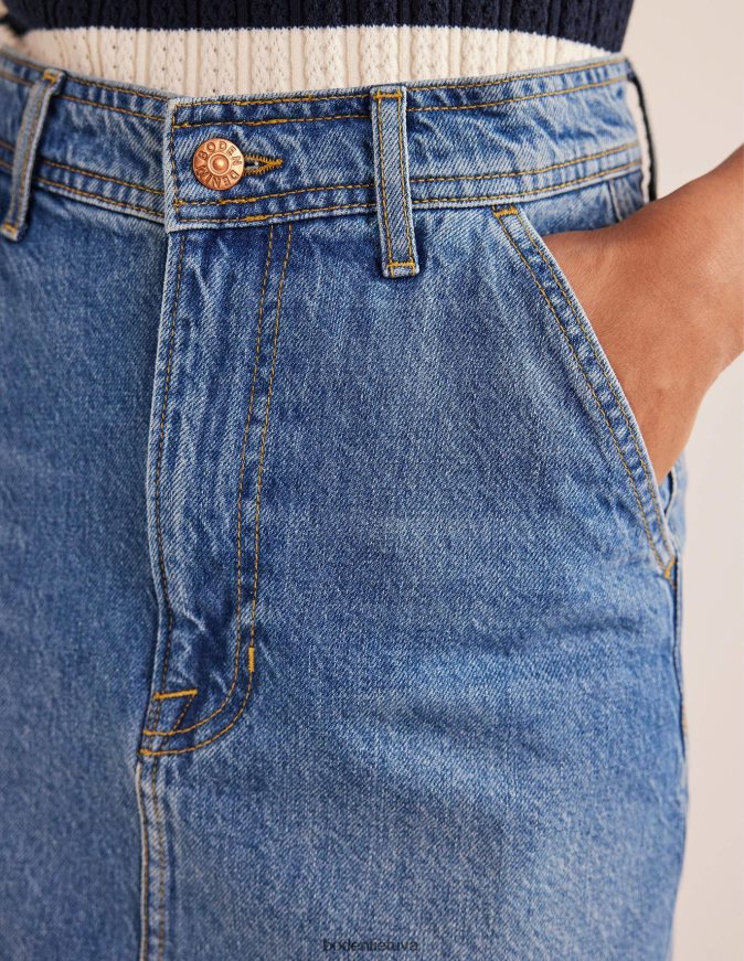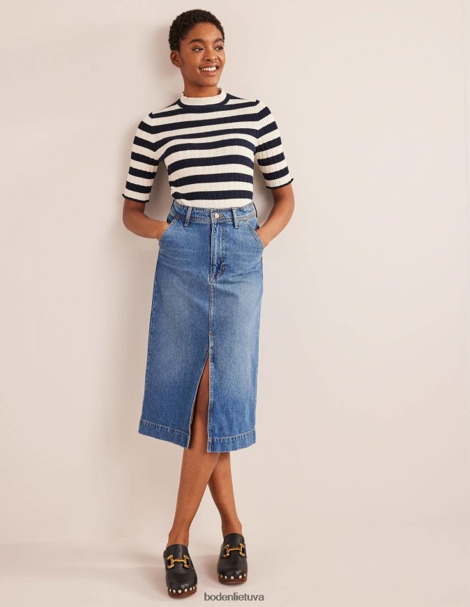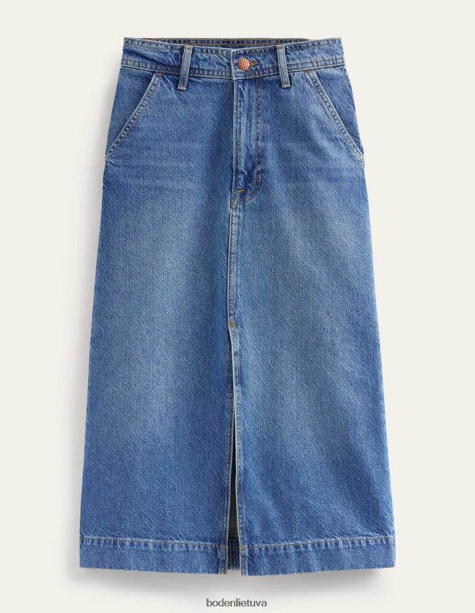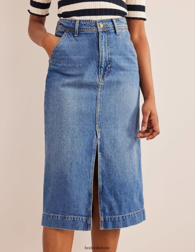 šis vidutinio dydžio sijonas yra pagamintas iš standaus džinsinio audinio ir yra tiesaus silueto. jis prigludęs prie natūralaus juosmens, o priekyje yra skeltukas, kad būtų lengviau judėti. dėvėsite visus metus.