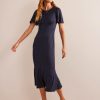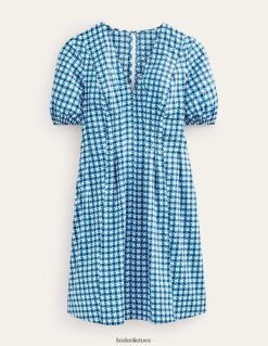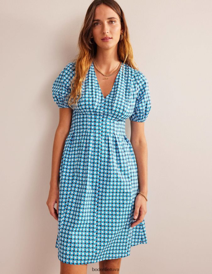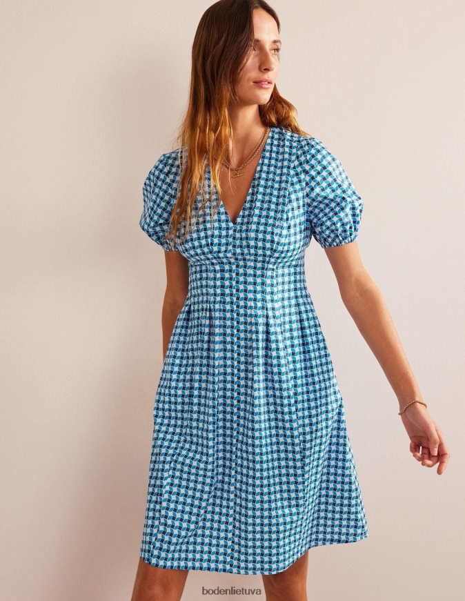 Smiginio juosmens detalė ant šios medvilninės mini suknelės suteikia pusiau aptemptos formos raiškumo. pūstos rankovės ir platėjantis pakraštys išlaiko modernumą, o gilus V formos iškirptė suteikia universalumo tiek dieną, tiek naktį.
